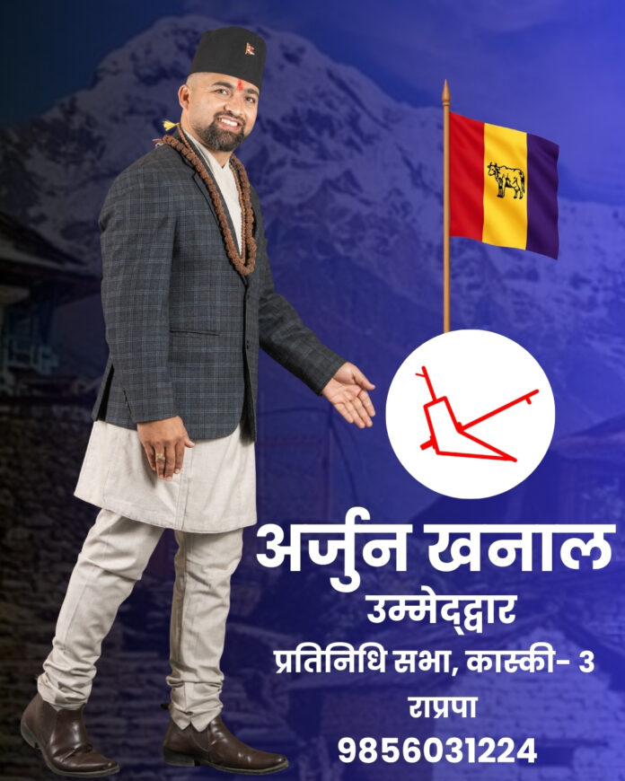पोखरा १४, माघ। आगामी फागुन २१ गते हुने प्रतिनिधिसभा निर्वाचनका लागि कास्की क्षेत्र नम्बर ३ मा चुनावी सरगर्मी बढेको छ। यस क्षेत्रमा विभिन्न राजनीतिक दल र स्वतन्त्र गरी १५ जना उम्मेदवारहरू चुनावी प्रतिस्पर्धामा रहेका छन्, जसमा राष्ट्रिय प्रजातन्त्र पार्टी (राप्रपा) का ३६ वर्षीय अर्जुन खनाल सबैभन्दा कम उमेरका उम्मेदवार बनेका छन्। खनालको राजनीतिक पृष्ठभूमि र वैचारिक यात्रा निकै रोचक रहेको छ। उनी कुनै समय कम्युनिस्ट आन्दोलनमा आबद्ध थिए, तर पछिल्लो समय उनी सनातन हिन्दु राज्य र राजसंस्थाको एजेन्डा बोकेर राप्रपामार्फत सक्रिय भएका हुन्। उनी हाल राप्रपाको केन्द्रीय सदस्य तथा पर्यटन विभाग सदस्यका रूपमा कार्यरत छन्।
